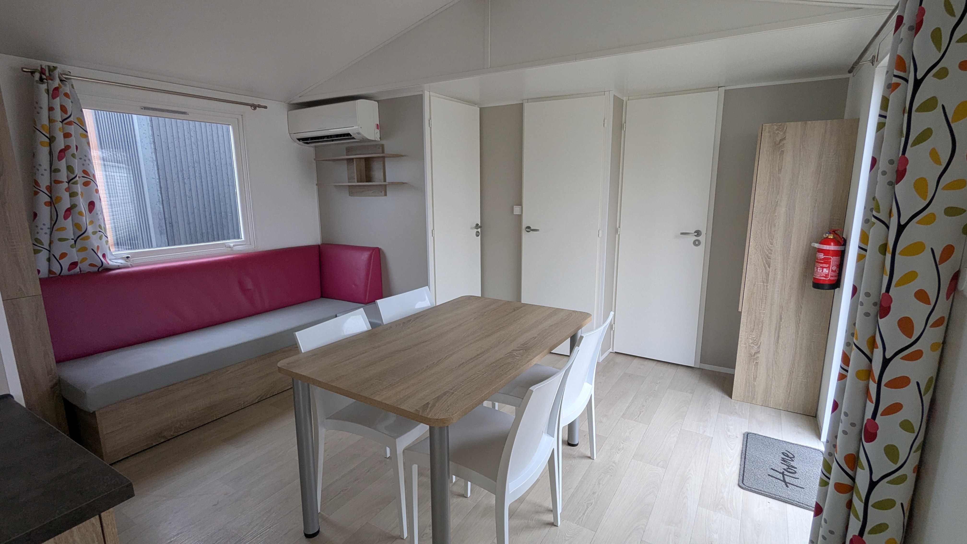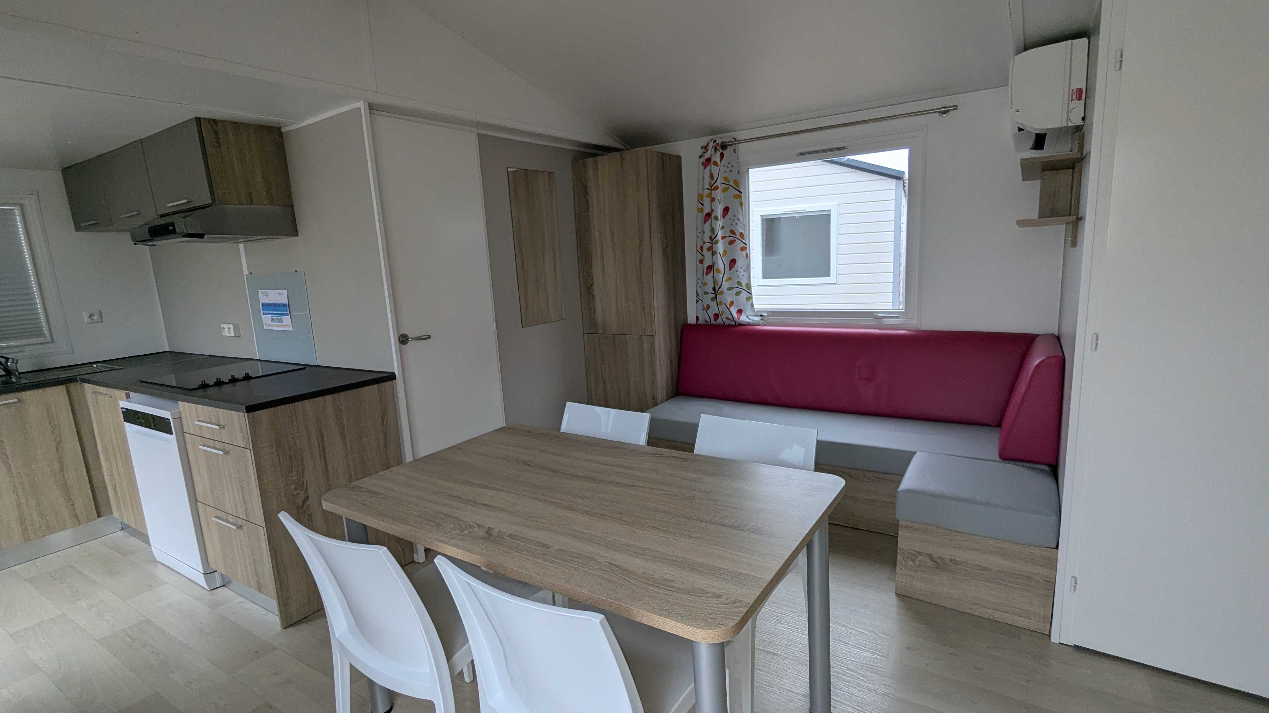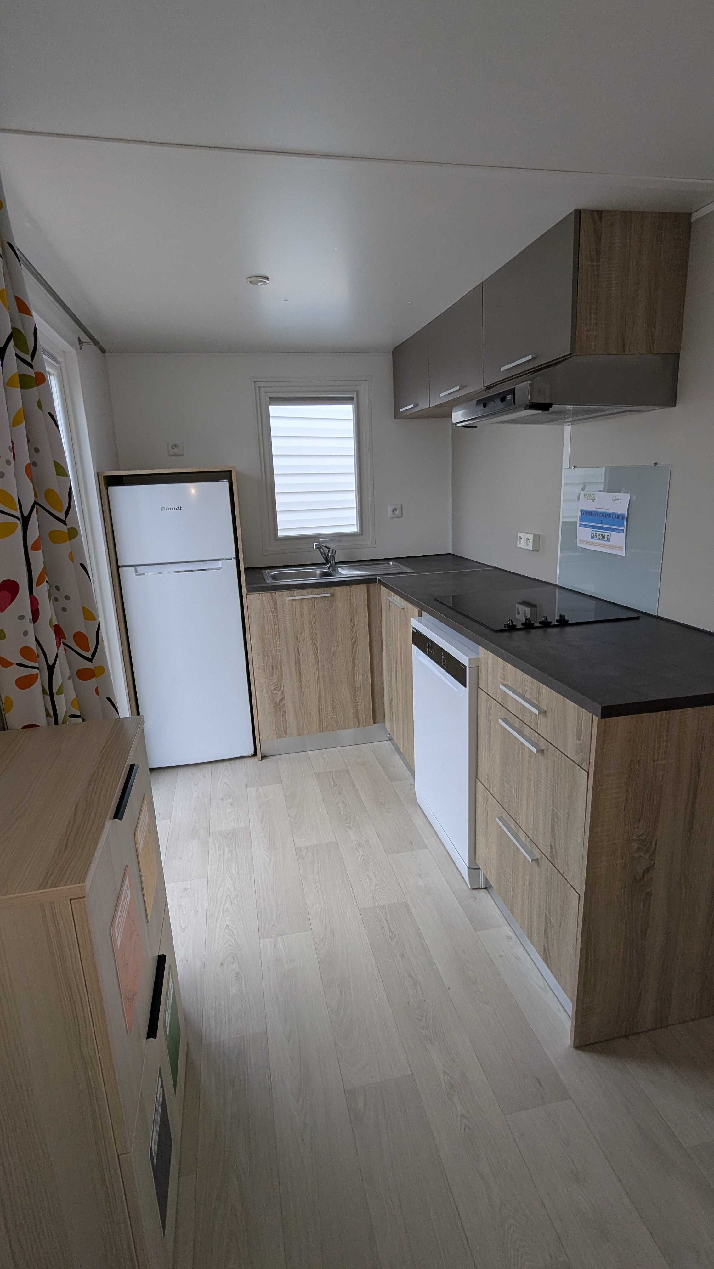 Mobil-home d'occasion 2 chambres très lumineux avec sa cuisine ouverte sur l'extérieur, en très bon état!!
